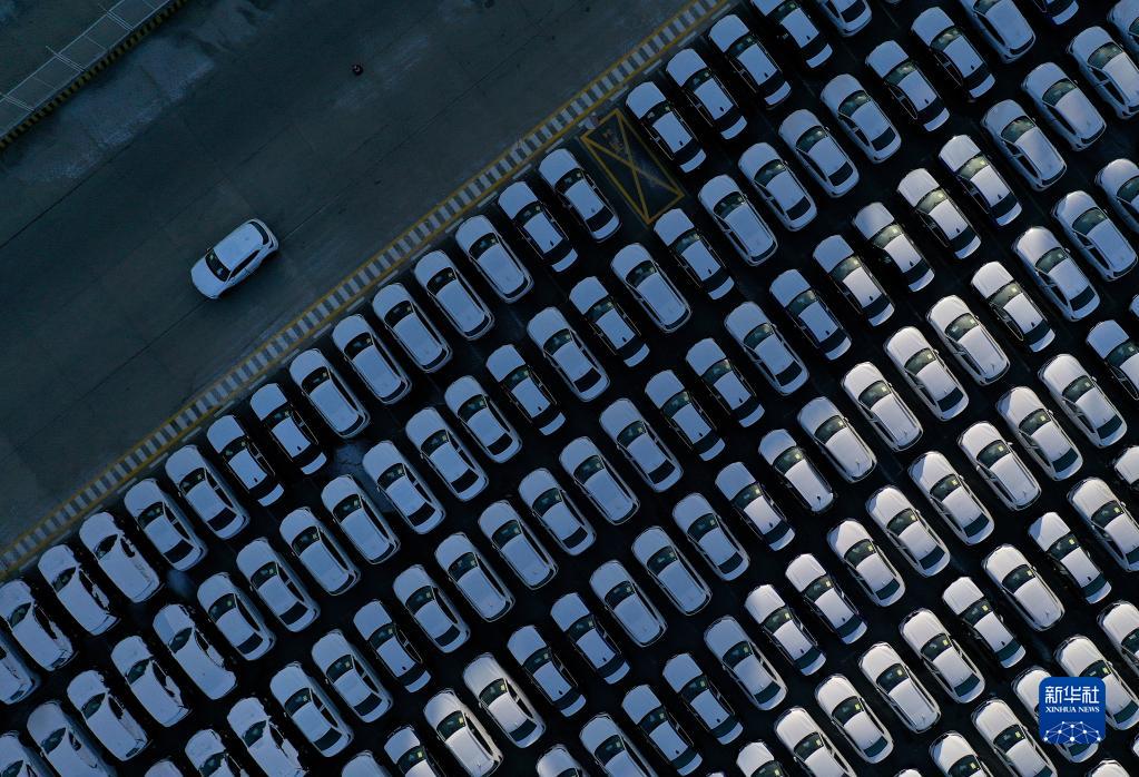 2021年1月29日,一辆运送中的商品车行驶在大连港汽车码头(无人机照片)。新华社记者 姚剑锋 摄