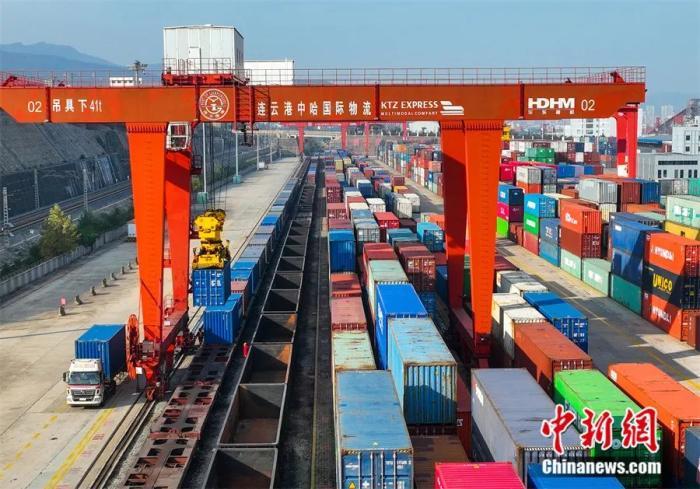 江苏连云港,中国-哈萨克斯坦(连云港)物流基地装卸忙。王健民 摄