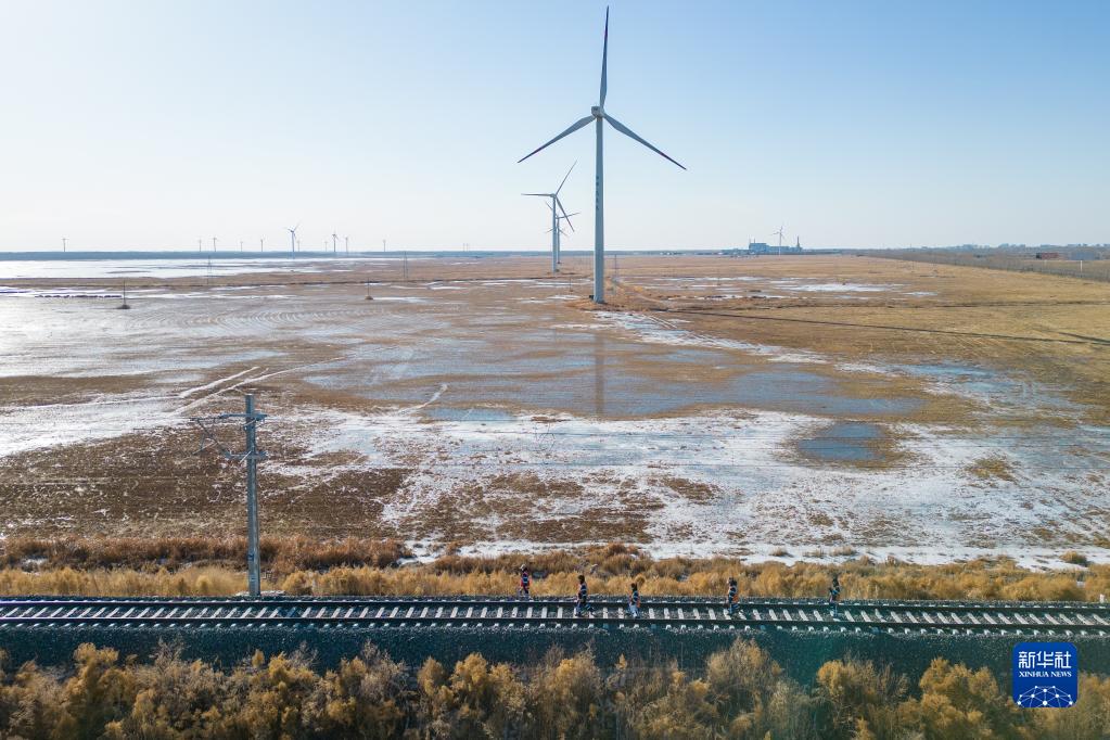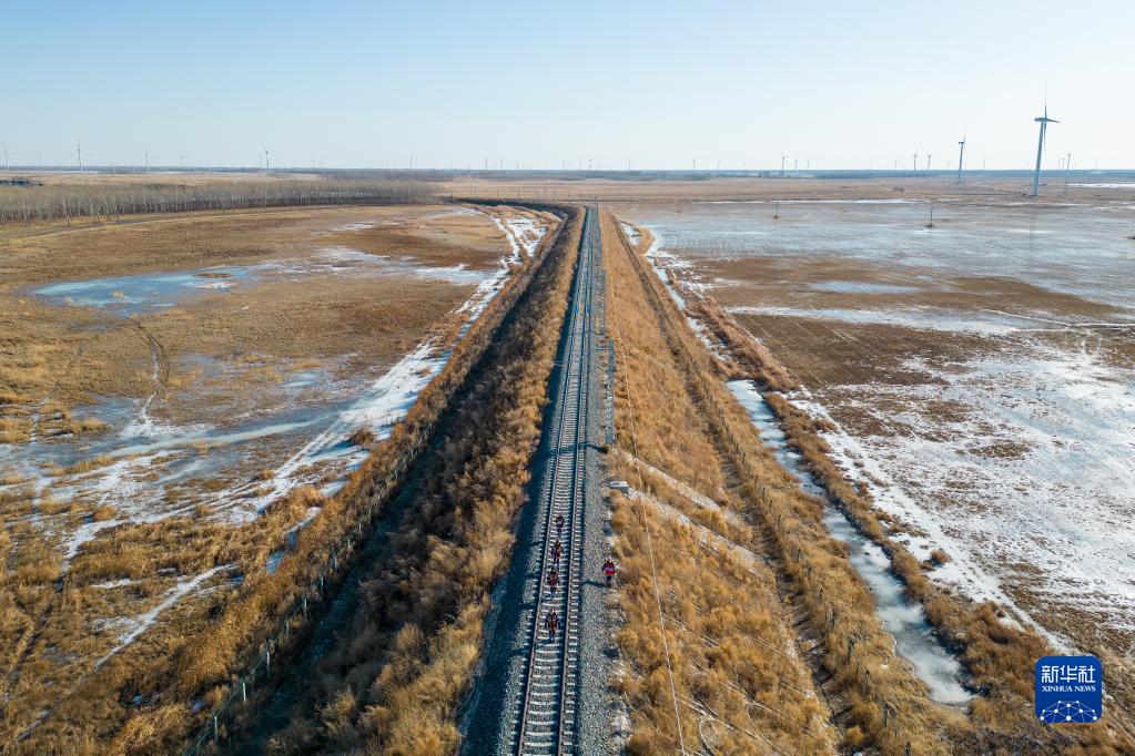 这是3月6日拍摄的女子检验班在滨洲线199公里处进行作业(无人机照片)。 新华社记者 张涛 摄