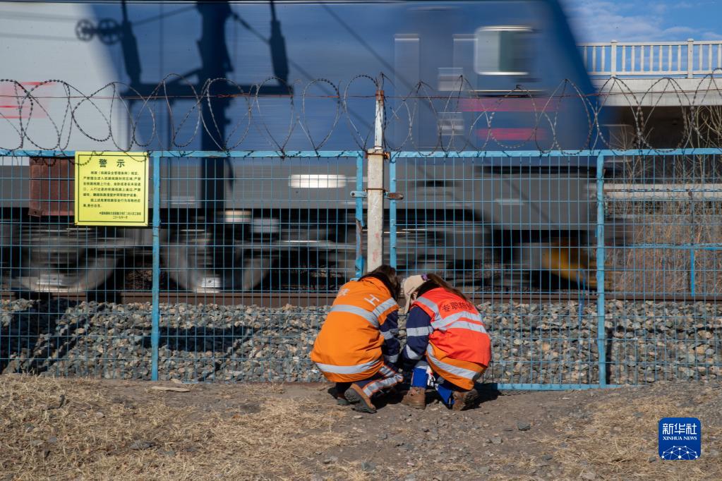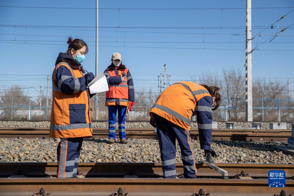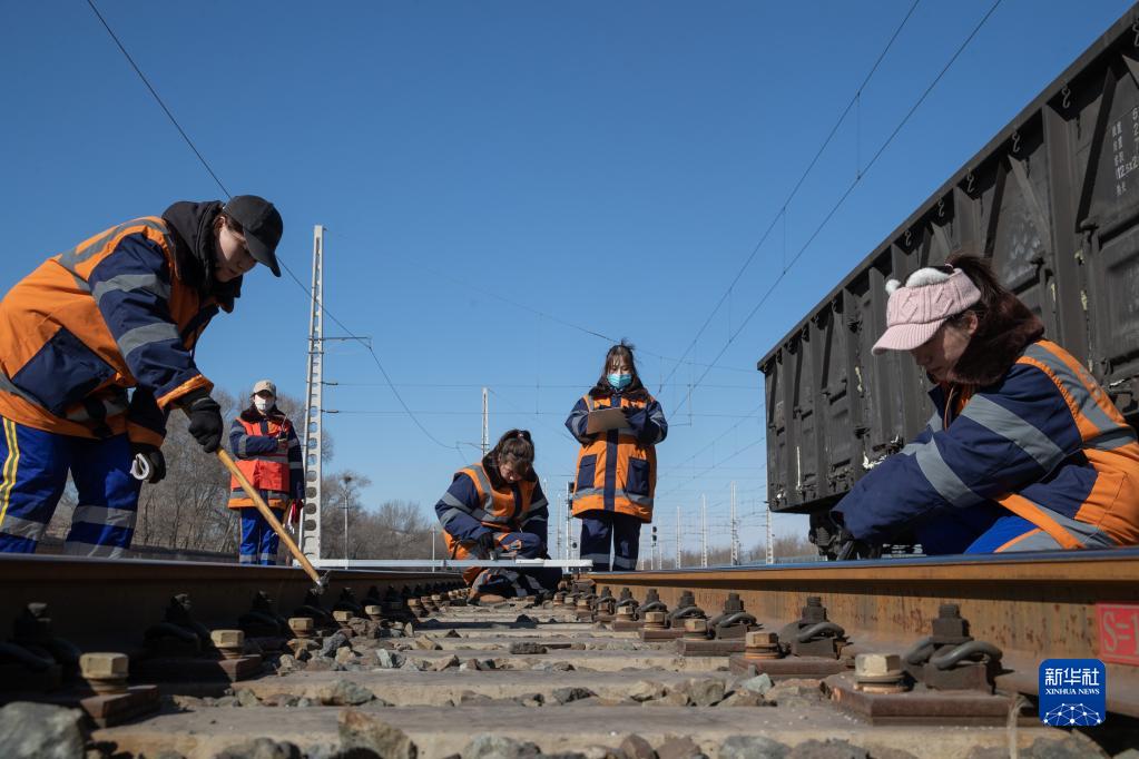 3月6日,女子检验班在滨洲线199公里处进行作业。 新华社记者 张涛 摄