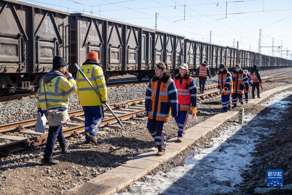 3月6日,在杜尔伯特火车站内,女子检验班前往作业点。 新华社记者 张涛 摄