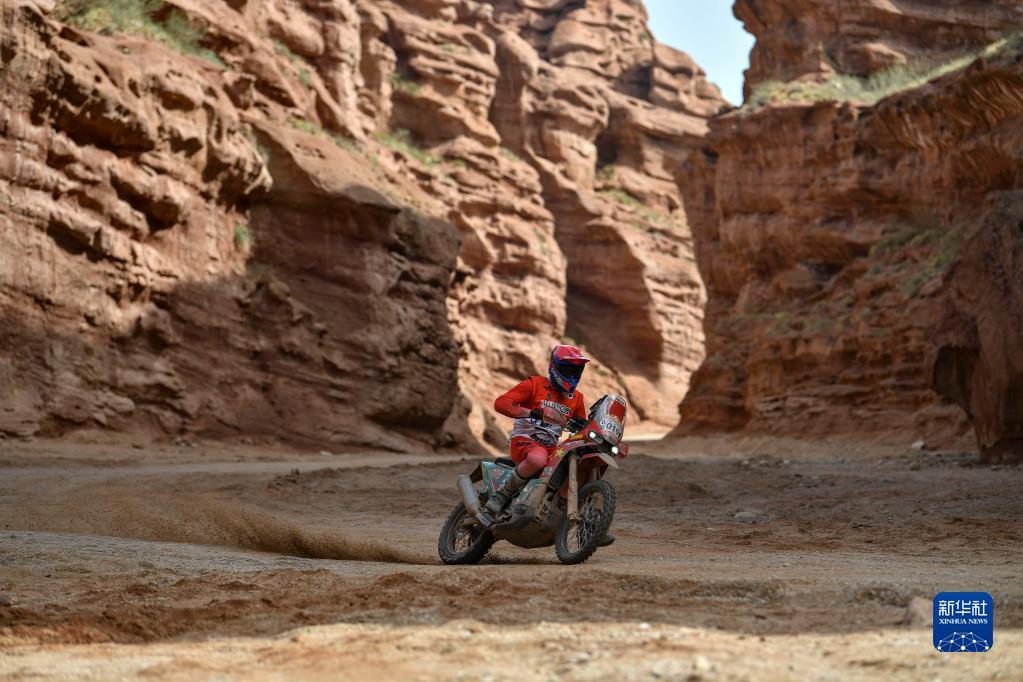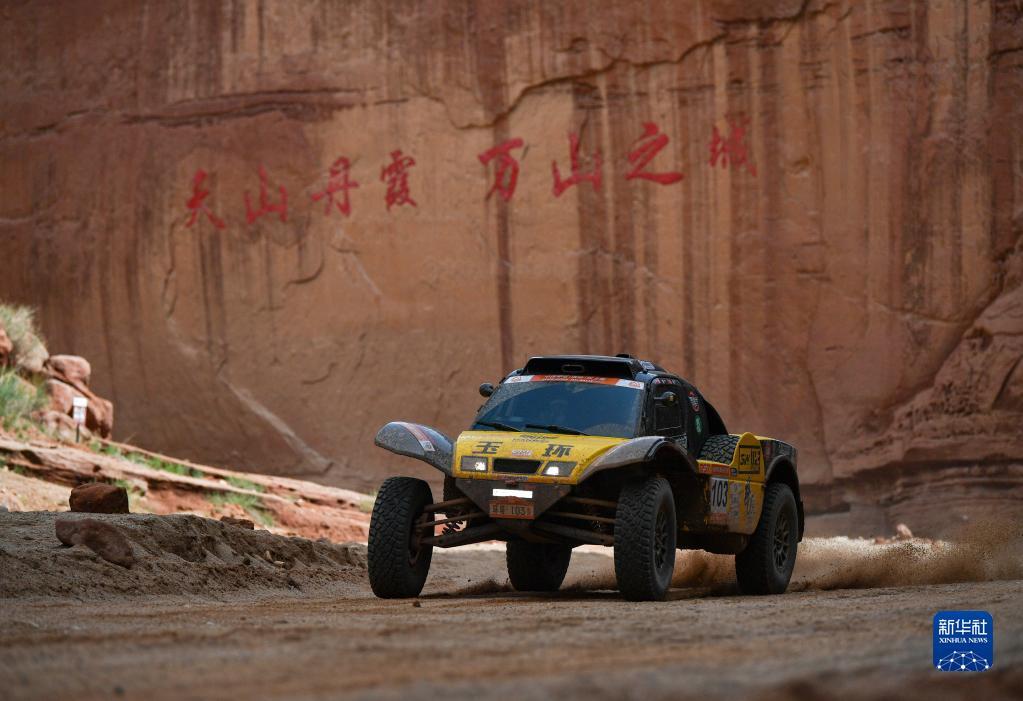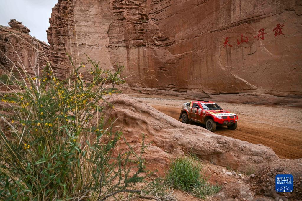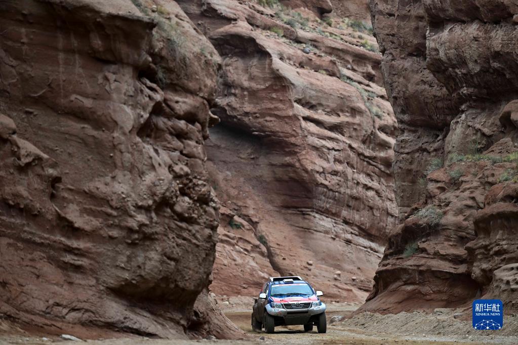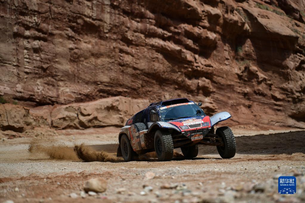 5月21日,阿克苏悟空车队车手周田、领航员姜旭龙驾驶赛车穿行在峡谷中。新华社记者 胡虎虎 摄