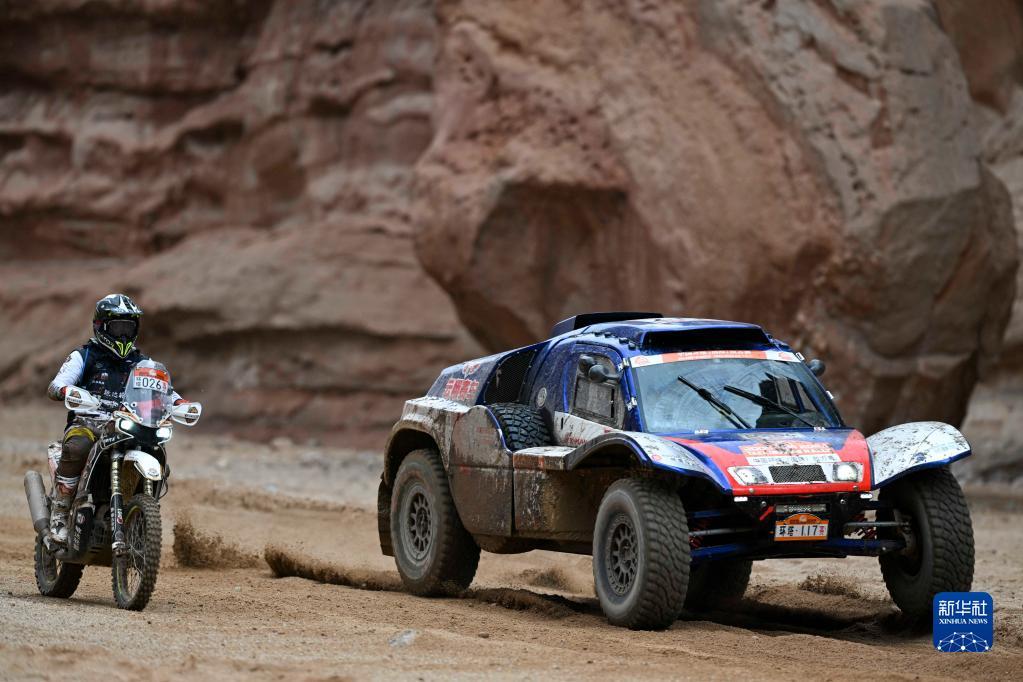 5月21日, 新疆枭龙无路野弛俱乐部车队车手张仟岳佟(左)在比赛中,陕西云翔俱乐部车手杜炫义、领航员潘宏宇驾驶赛车从一旁驶过。新华社记者 胡虎虎 摄