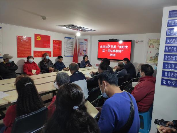 5月15日,东庄社区法律明白人为辖区居民讲授《中华人民共和国民法典》相关知识,辖区居民代表参加活动。