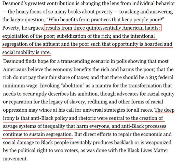 卡辛在文中指出,正如德斯蒙德所分析的那样,在底层挣扎的美国草根民众之所以陷入根深蒂固的、令人难以忍受的贫困,根源在于三个典型的“美国习惯”:对穷人的剥削;对富人的补贴;以及有意将富人和穷人隔离开来。