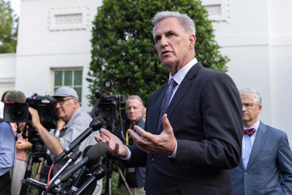 5月22日,在美国华盛顿白宫,国会众议长、共和党人凯文·麦卡锡就债务上限问题与美国总统拜登谈判后回答记者提问。(新华社发,亚伦摄)