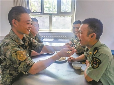图②:中士张怀晨为退伍的上等兵喂饺子。易志明摄