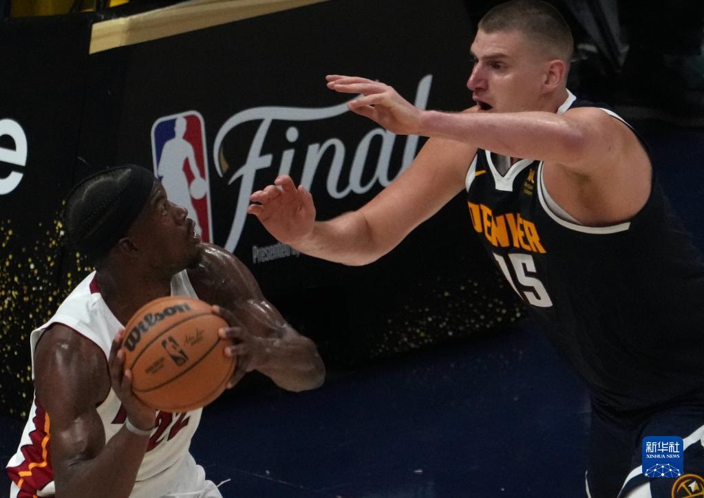 6月4日,丹佛掘金队球员尼古拉·约基奇(右)在比赛中防守迈阿密热火队球员吉米·巴特勒。新华社记者 吴晓凌 摄(吴晓凌)