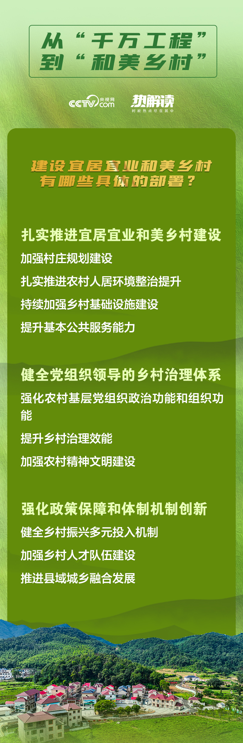 央视网《热解读》栏目特别策划“从‘千万工程’到‘和美乡村’”系列解读文章,紧扣乡村振兴战略“产业兴旺、生态宜居、乡风文明、治理有效、生活富裕”总要求,全面展现新时代中国多措并举建设宜居宜业和美乡村的生动实践。