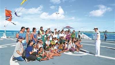 晚7时许,基里巴斯客人陆续登船,纷纷在摆满中国特色美食的餐台前驻足,在印有“中国-基里巴斯友谊长存”的横幅下合影。甲板招待会上,中国海军官兵的舞狮、武术等精彩表演,赢得基方朋友阵阵掌声和欢呼……这是一场传递友谊的盛宴,更是一次播撒大爱的旅程。
