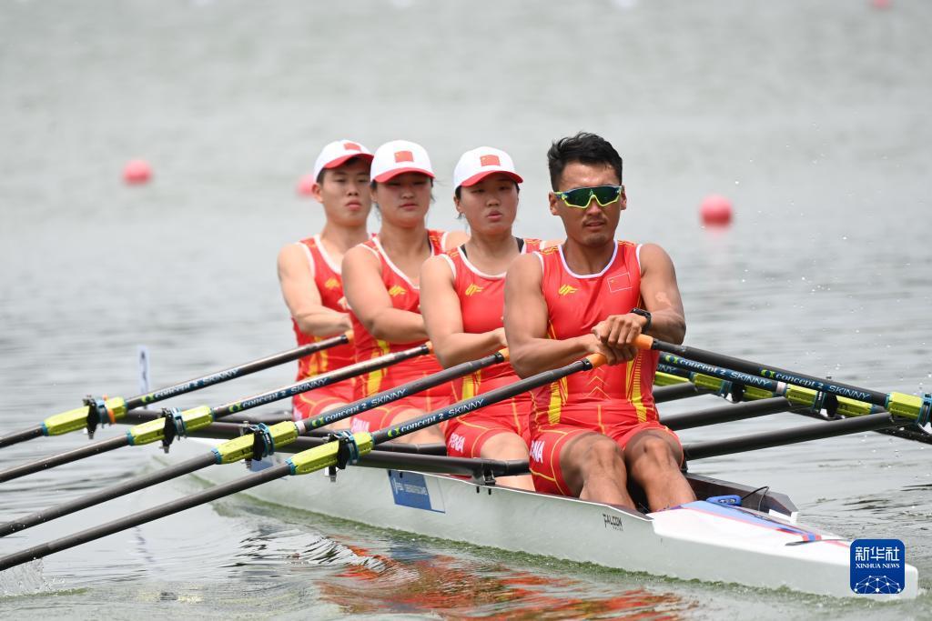 8月4日,中国队选手在混合四人双桨预赛中,他们以6分45秒49的成绩晋级复活赛。新华社记者 蔡湘鑫 摄