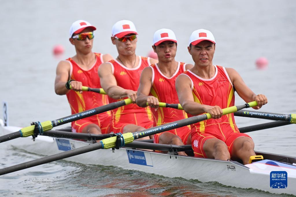 8月4日,中国队选手在男子四人单桨预赛中,他们以6分18秒30的成绩晋级决赛。新华社记者 蔡湘鑫 摄