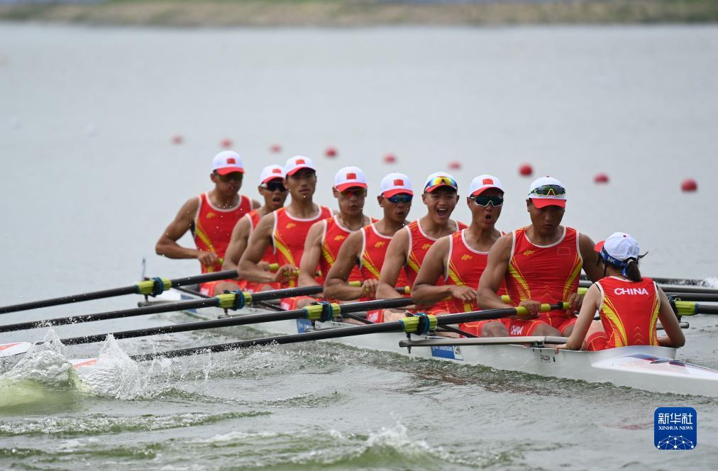 8月4日,中国队选手在男子八人单桨有舵手排道赛中,他们以5分56秒12的成绩晋级决赛。新华社记者 蔡湘鑫 摄(蔡湘鑫)