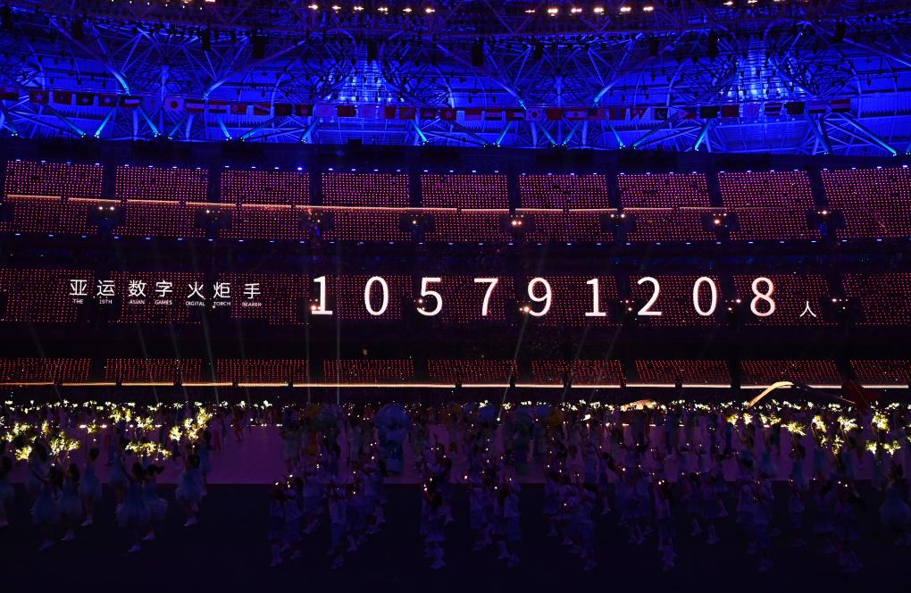 这是9月23日拍摄的开幕式现场显示的亚运数字火炬手人数。新华社记者黄宗治摄