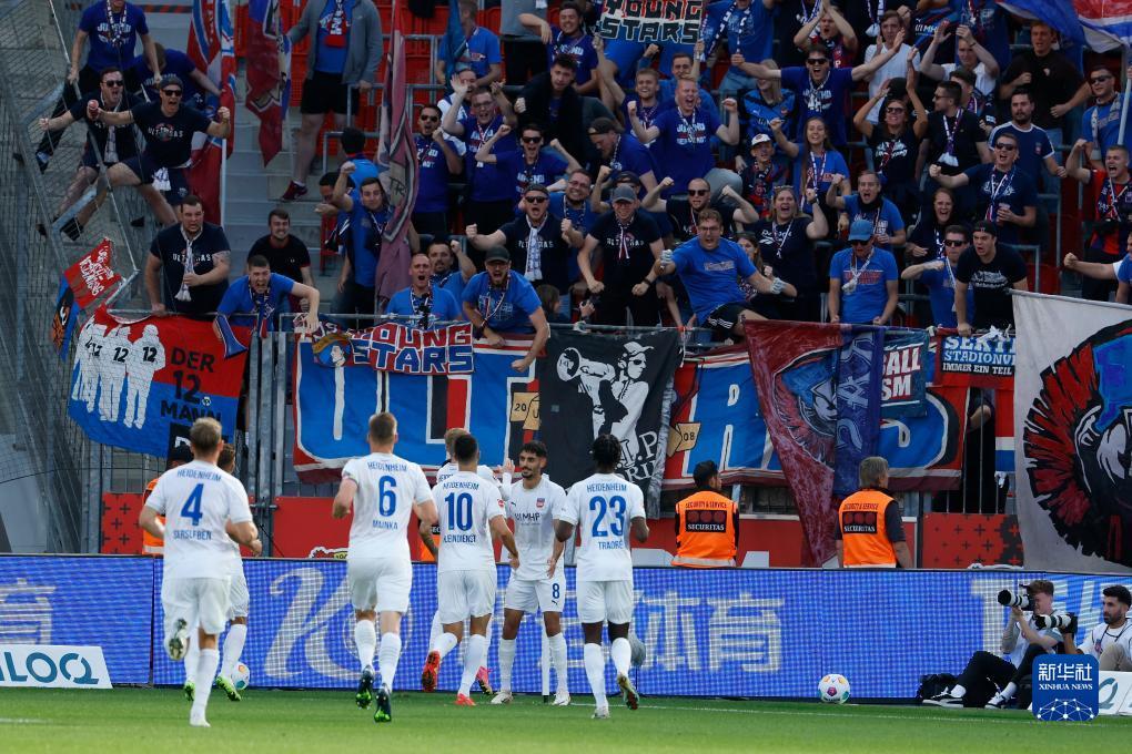 9月24日,海登海姆队球员丁奇(右二)进球后与队友庆祝。