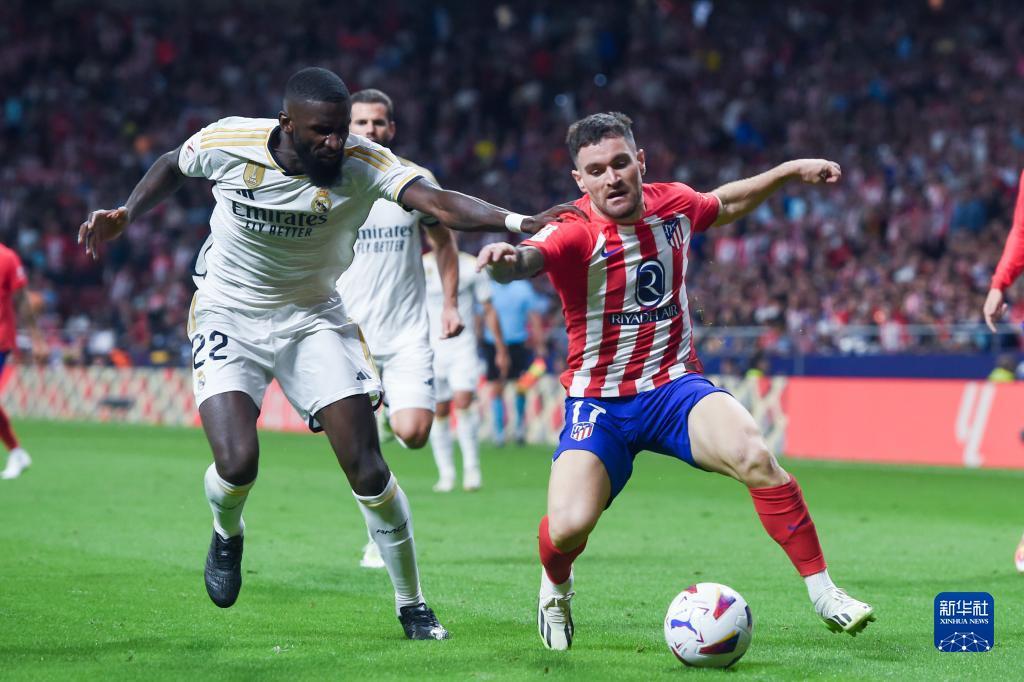 9月24日,皇家马德里队球员吕迪格(左)与马德里竞技队球员加兰在比赛中对抗。