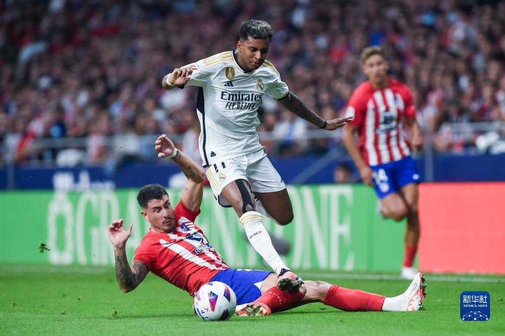 9月24日,皇家马德里队球员罗德里戈(前右)与马德里竞技队球员埃尔莫索在比赛中拼抢。