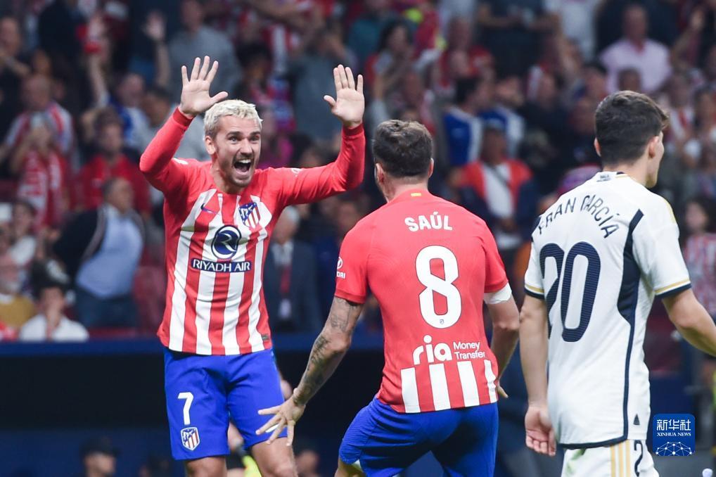9月24日,马德里竞技队球员格列兹曼(左)与萨乌尔在比赛中庆祝进球。