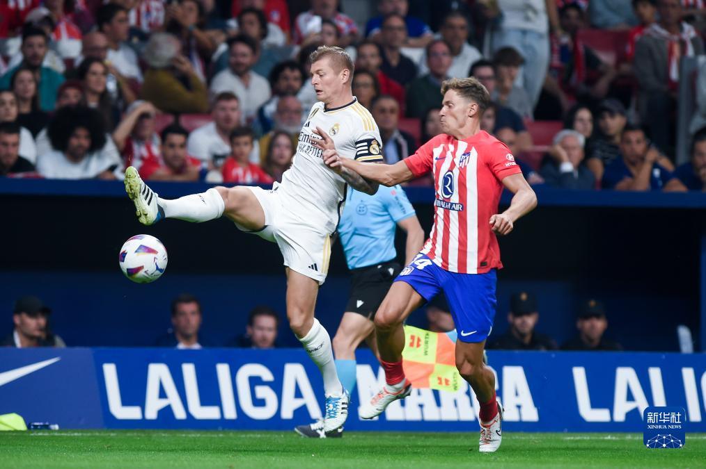 9月24日,皇家马德里队球员克罗斯(左)与马德里竞技队球员马科斯·略伦特在比赛中拼抢。