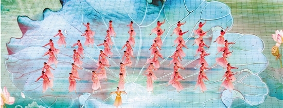 不一会儿,烟雨西湖上,硕大的莲叶舒展,身着淡粉色的清雅隽秀女子在立体的景致中,踮起脚尖,翩然起舞,优雅的芭蕾舞姿,仿若盛开的莲花,美轮美奂,令在场观众发出连声惊叹。