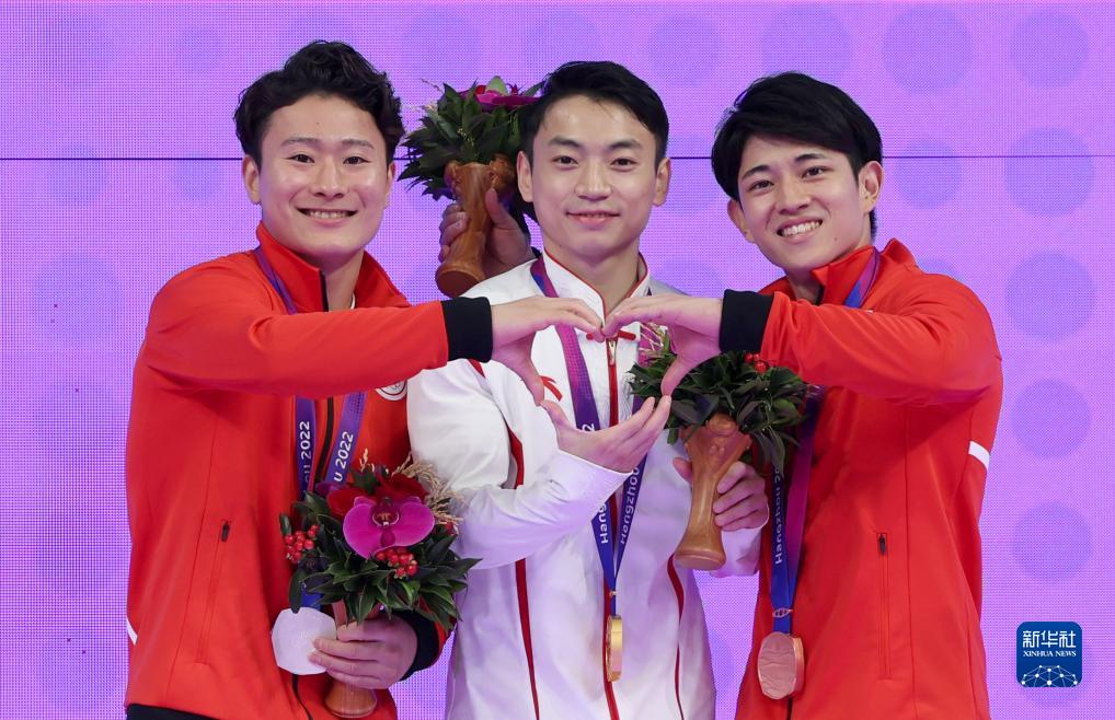 9月29日,亚军日本选手北园丈琉、冠军中国选手邹敬园和季军日本选手谷川翔(左至右)在颁奖仪式上。