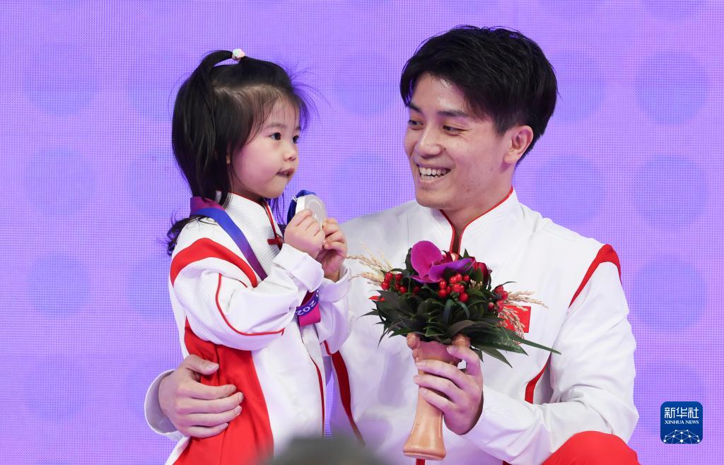 9月29日,亚军中国选手林超攀在颁奖仪式后与女儿合影。