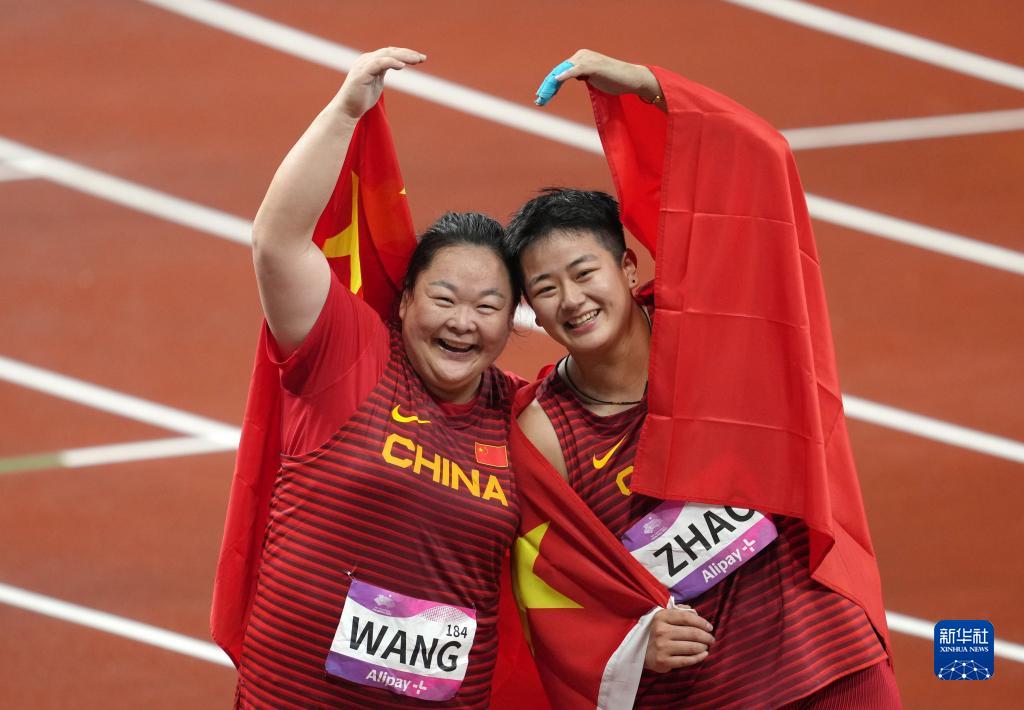9月29日,中国选手王峥(左)、赵杰在比赛后庆祝。王峥以71.53米的成绩获得冠军,赵杰以69.44米的成绩获得亚军。