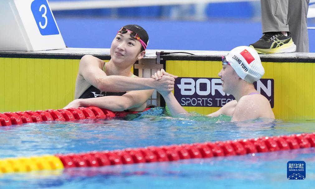 9月29日,中国选手张雨霏(右)与日本选手池江璃花子在比赛后,张雨霏以25秒10的成绩获得冠军并创造新的亚运会纪录,池江璃花子获得季军。