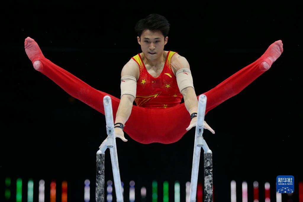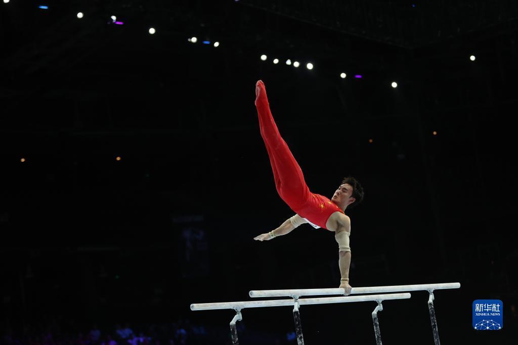 9月30日,中国队选手侍聪在男子资格赛双杠比赛中。新华社记者 赵丁喆 摄