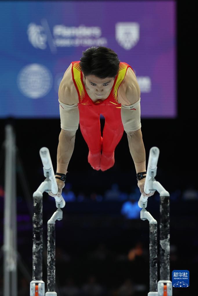 9月30日,中国队选手侍聪在男子资格赛双杠比赛中。新华社记者 郑焕松 摄