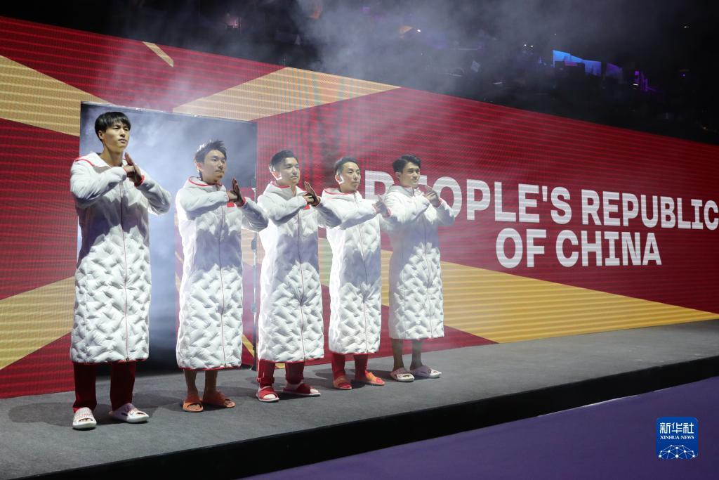 9月30日,中国选手苏炜德、孙炜、刘洋、尤浩、侍聪(从左至右)出场参加男子资格赛。新华社记者 郑焕松 摄