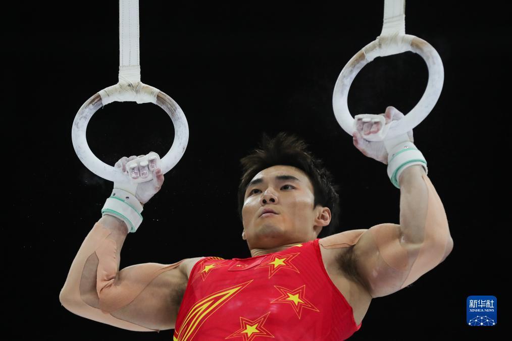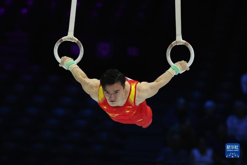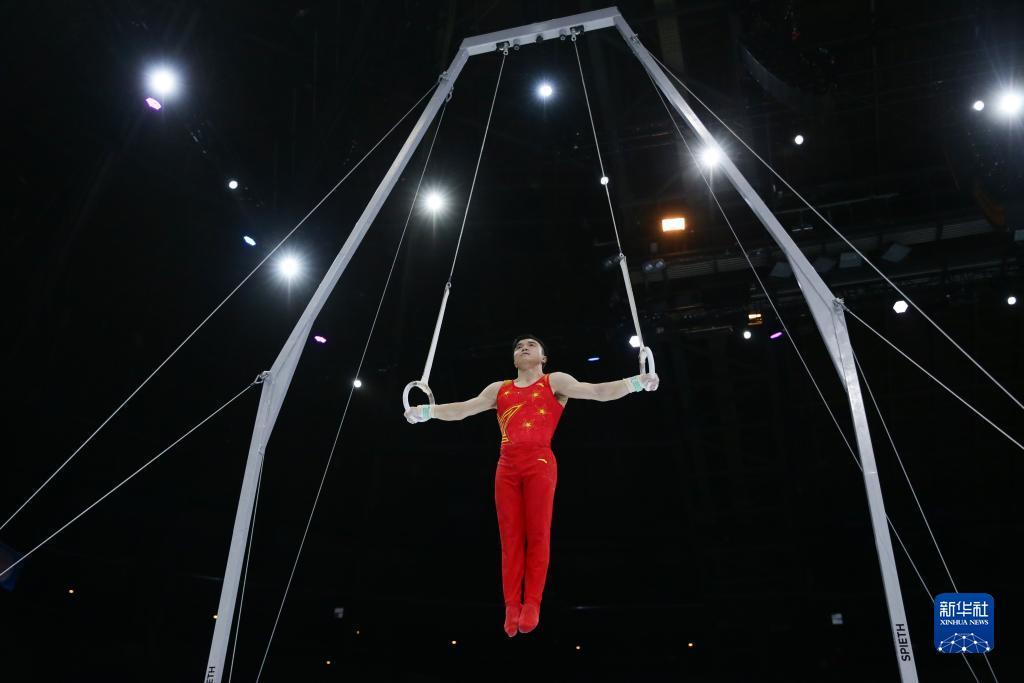 9月30日,中国队选手刘洋在男子资格赛吊环比赛中。新华社记者 赵丁喆 摄
