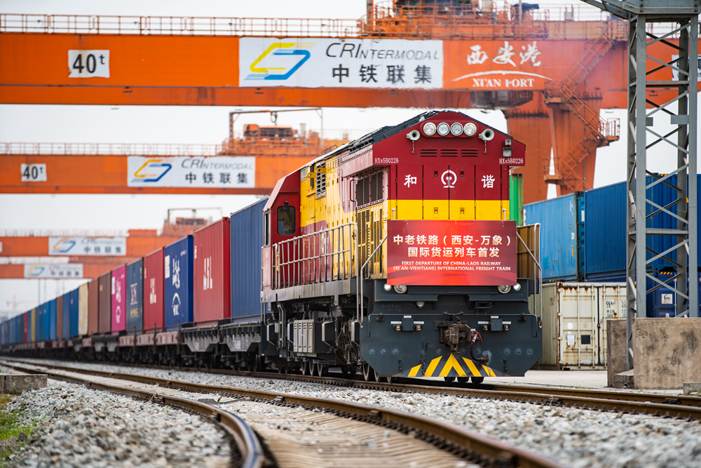 2022年4月22日,陕西西安首趟中老铁路(西安至万象)国际货运列车从西安国际港站发车。新华社记者 刘翔 摄