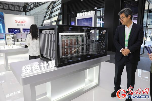 中科曙光采用国际领先的全浸式液体相变冷却技术,以低沸点、不导电液体作为冷媒,将服务器所有部件均浸没在冷媒中,为服务器提供了一个稳定的运行环境。图为2023年11月7日,“互联网之光”博览会上展示的绿色计算模块。(光明网记者崔益明/摄)