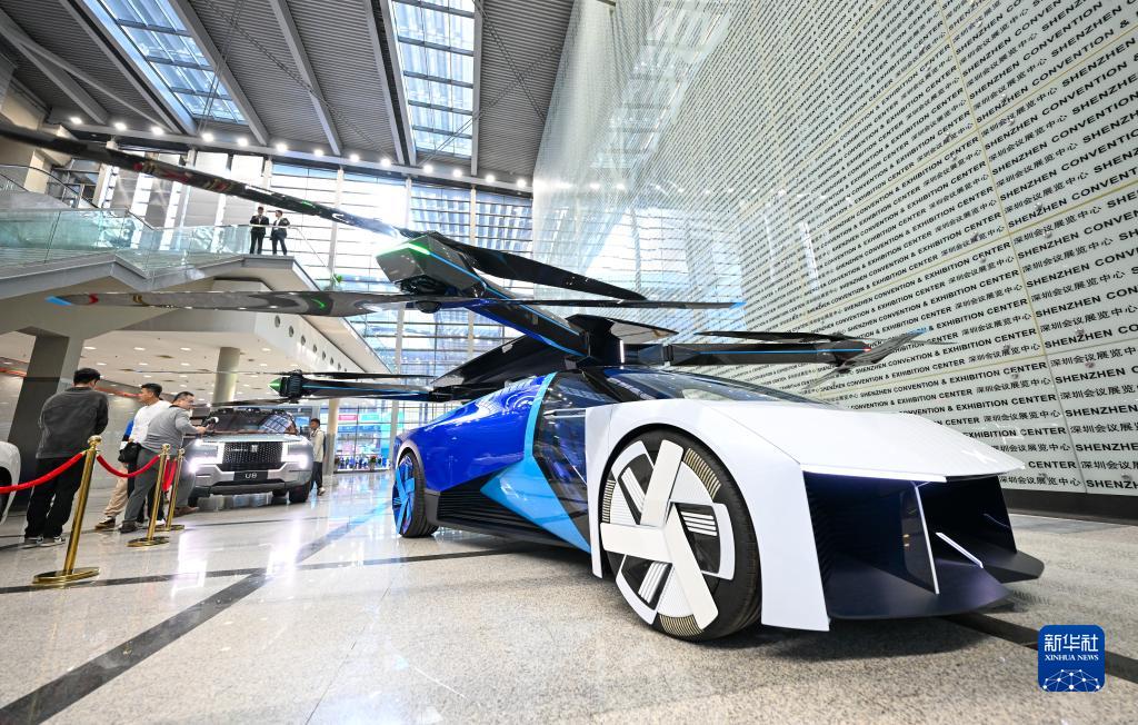 11月15日,在第二十五届高交会上,机臂、旋翼等飞行系统可以完全折叠收纳的小鹏汇天陆空一体式飞行汽车对公众展出。