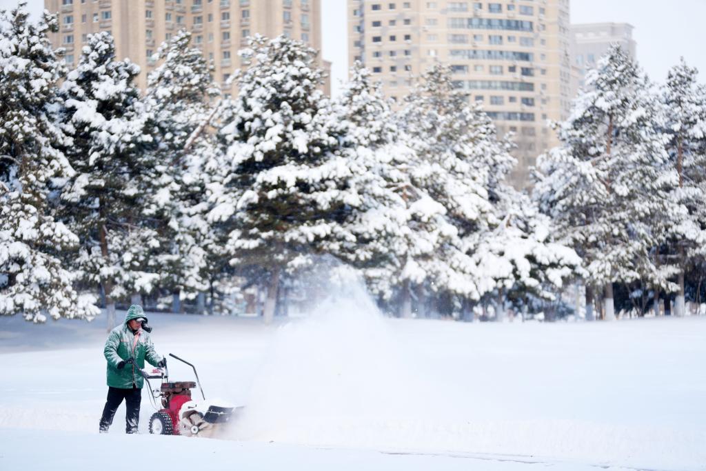 11月23日,在哈尔滨市湘江公园,工作人员在清理积雪。受寒潮影响,黑龙江省各地近日持续降温。新华社记者 王建威 摄
