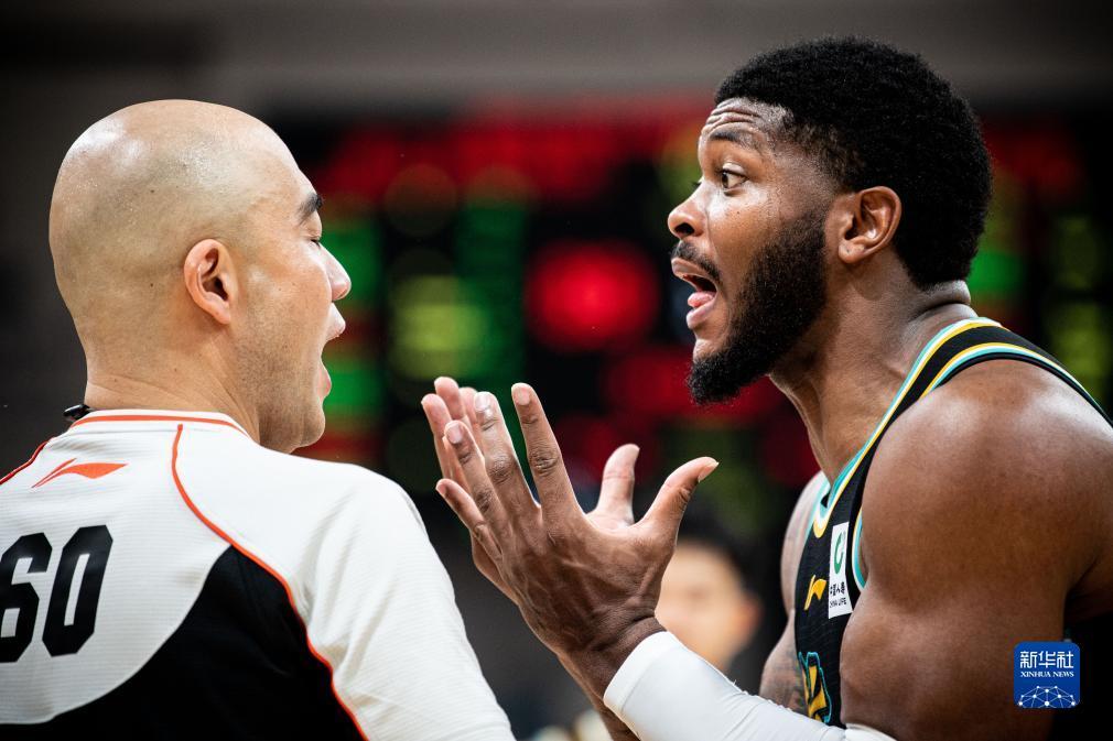 12月4日,浙江东阳光药队球员奥利弗(右)在比赛中向主裁判郭楠申诉。新华社记者 江汉 摄