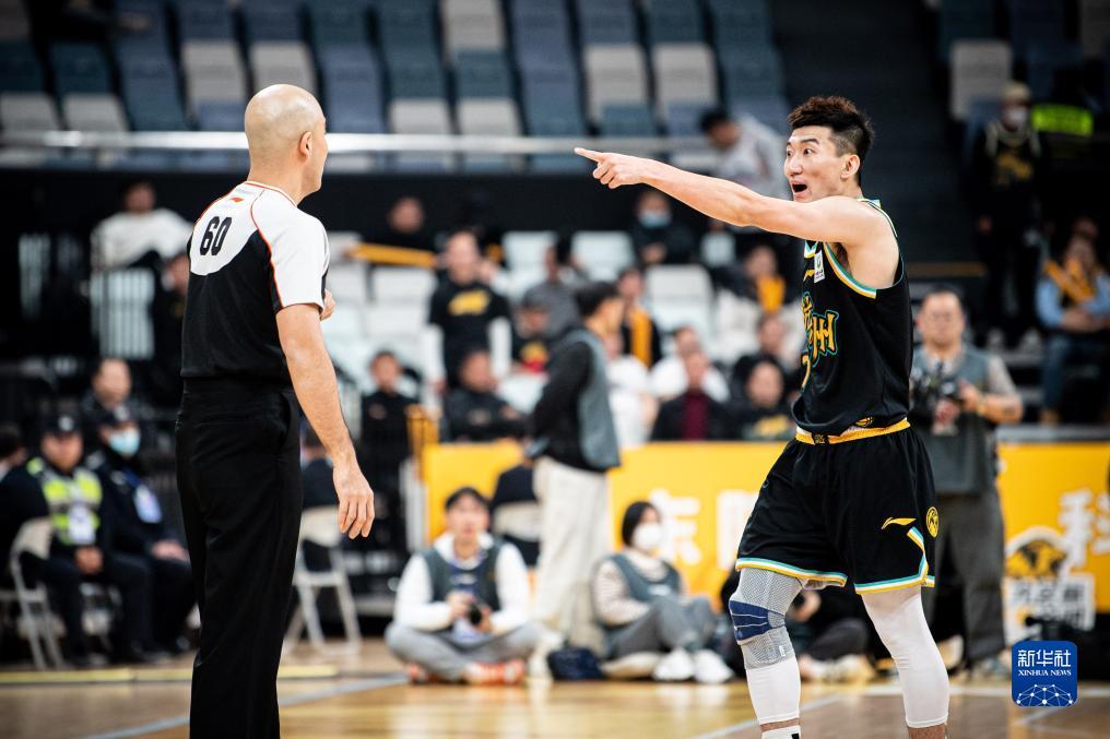 12月4日,浙江东阳光药队球员孙铭徽(右)在比赛中对判罚表达不满。新华社记者 江汉 摄