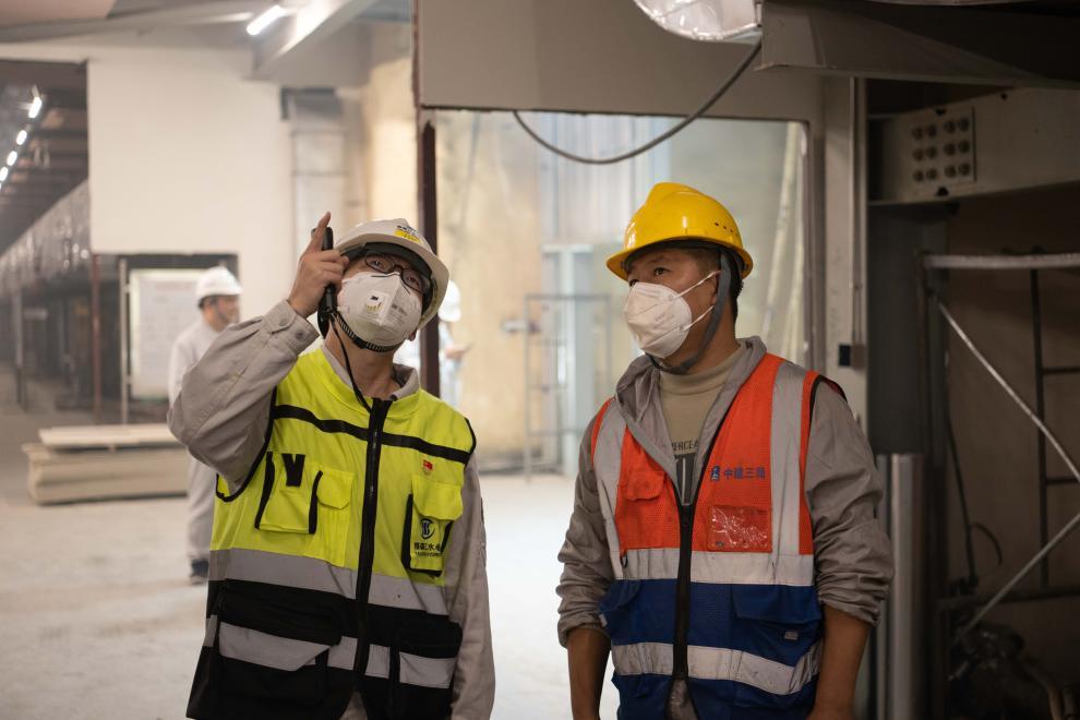 11月7日,李宏璧(左)在锦屏大设施实验厅内与施工方沟通方案。新华社记者 胥冰洁 摄