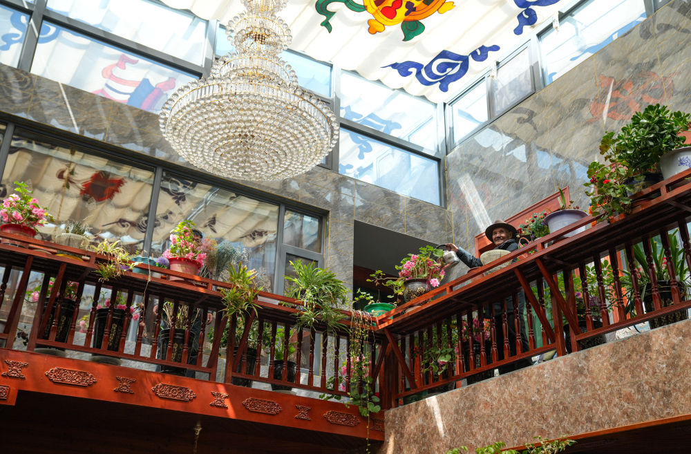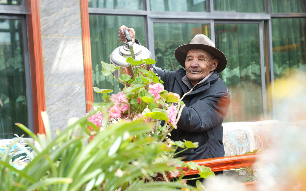 朗杰在自家二楼给花浇水(3月13日摄)。新华社记者 晋美多吉 摄