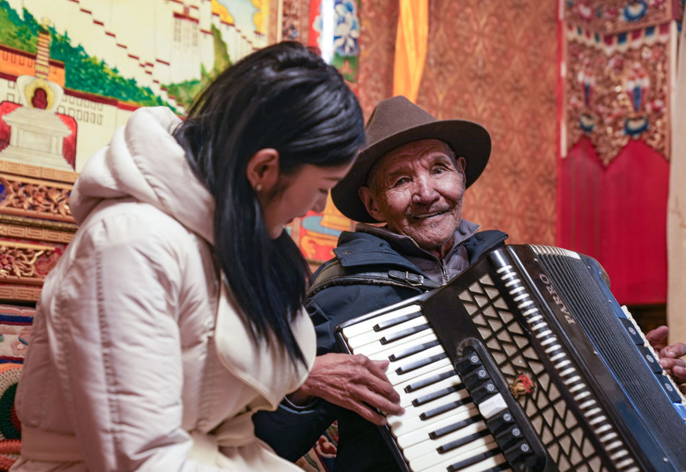 朗杰(右)指导孙女索朗曲珍拉手风琴(3月13日摄)。新华社记者 晋美多吉 摄