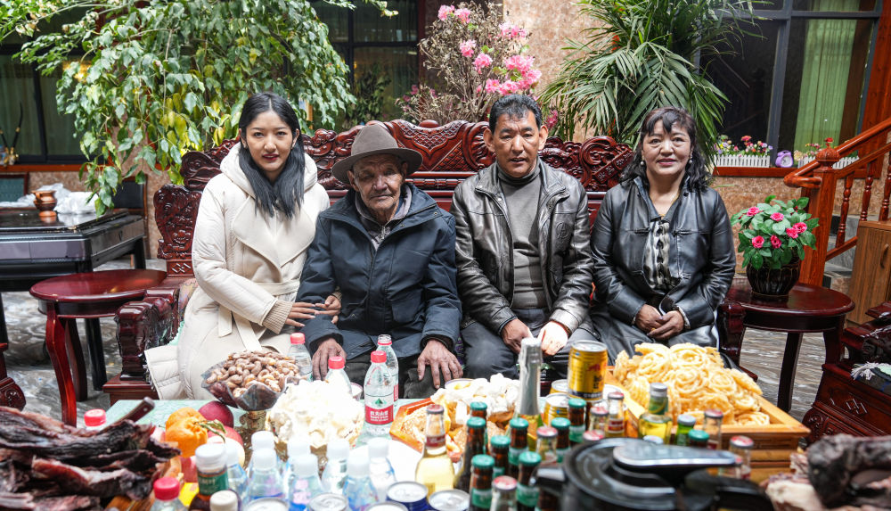 孙女索朗曲珍、朗杰(左二)、二儿子尼玛和二儿媳次旦卓嘎在家中合影(3月13日摄)。新华社记者 晋美多吉 摄