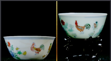 △ 明成化青花鸡缸杯(斗彩半成品)与明成化斗彩鸡缸杯(残)