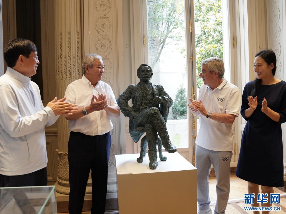 巴黎时间8月3日,著名艺术家袁熙坤创作的顾拜旦雕塑在法国巴黎中国之家揭幕。国际奥委会主席巴赫、国际奥委会委员、中国奥委会副主席于再清,国家体育总局副局长、中国奥委会副主席周进强,国际奥委会委员、奥运冠军张虹共同为雕塑揭幕。