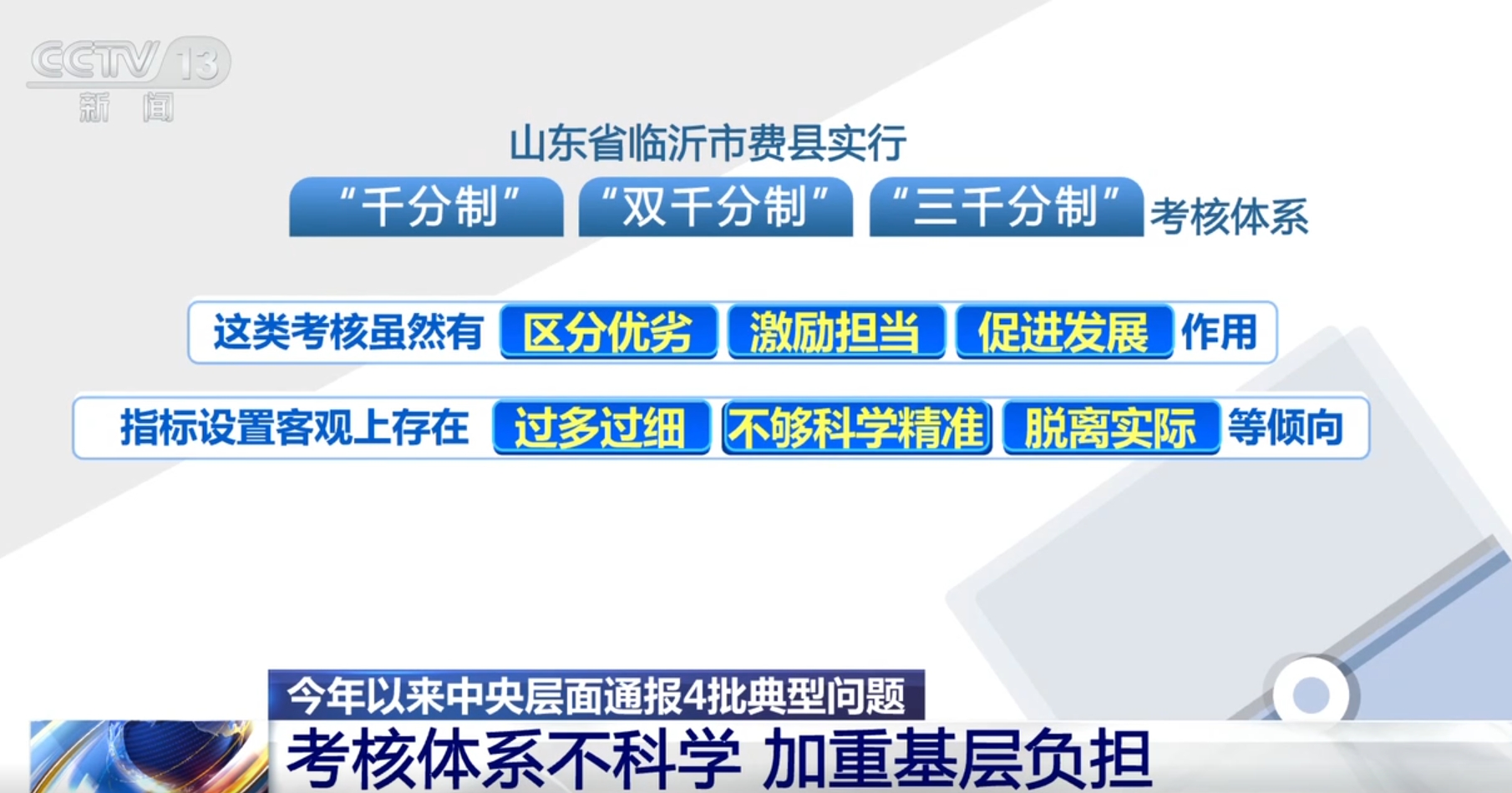 从通报的问题看,有的地方考核体系不够科学,加重基层负担。比如山东省临沂市费县实行“千分制”甚至“双千分制”“三千分制”考核体系。这类考核虽然有区分优劣、激励担当、促进发展的作用,但指标设置客观上存在过多过细、不够科学精准、脱离实际等倾向,还有的考核频率过高,实行月度排名、季度通报,不利于干部树立长远政绩观,加重了基层负担。