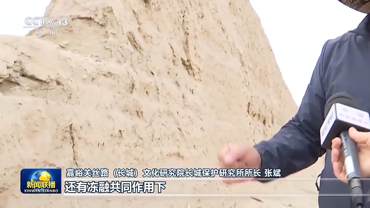 嘉峪关丝路(长城)文化研究院长城保护研究所所长 张斌:这块就是风雪,还有冻融共同作用下,形成一个很深的掏蚀凹槽,可能掏蚀进去20多公分,所以我们通过对它进行日常维护,就是对它进行夯补,它这个墙体的稳定性就好了。