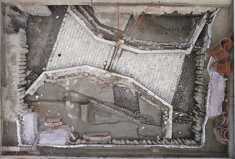 宋建:我根据管钻探到的铁锭榫,它是古建筑里边很重要的建筑材料,主要连接石材拼缝的地方,所以我认为地底下的遗迹不可能是近现代的东西,肯定是古代的。我汇报完以后,时任文管委副主任的汪庆正先生也认可铁锭榫的价值,因为铁锭的形状跟古代的银元宝很相像,他也认为这个东西所属年代不会晚。但是这个事情又很复杂,一则遗址埋藏在地下7米深,再则这块土地已经拍卖给房地产开发商,所以他也很难拍板,于是他就跟我说,我交给你个任务,你在7天之内把遗址的年代、性质搞清楚,得出一个初步结论进行汇报。