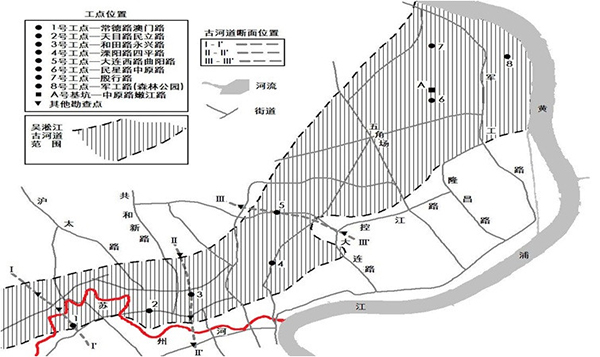 北宋以前太湖流域吴淞江下游的位置。上世纪80年代,上海进行地质普查,复原了古吴淞江河道,图中红色标注的就是现在的苏州河。