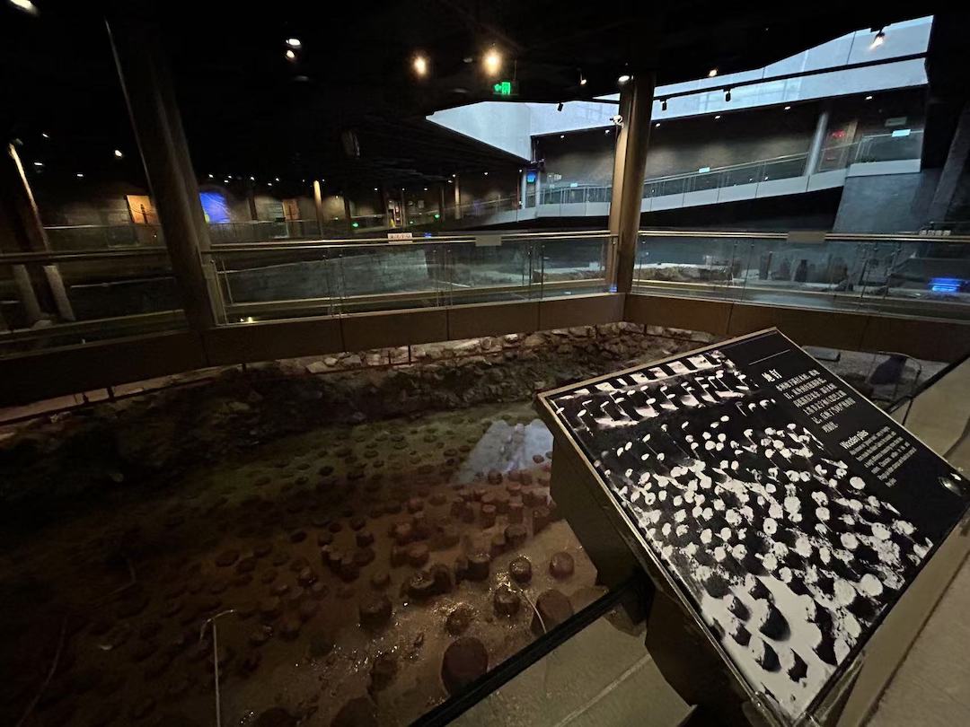 场馆分序厅和遗址陈列两部分,序厅在地上,介绍志丹苑元代水闸遗址的发现故事。步入遗址厅,才发现里边别有洞天,水闸遗址所在的遗址陈列厅位于地表以下10多米深处,从入口沿着楼梯缓步下坡,700多年前的水利工程设施遗址赫然出现于眼前。环形玻璃栈道悬空搭建在遗址边缘的上方,沿着栈道走一圈正好环绕中间的水闸遗址主体一周。“你们站在栈道上往下看,凡是手不可触摸的地方都已距今七百多年了,包括一块砖,一个石子,一根木桩。”展厅内的保安对前来参观的观众说。