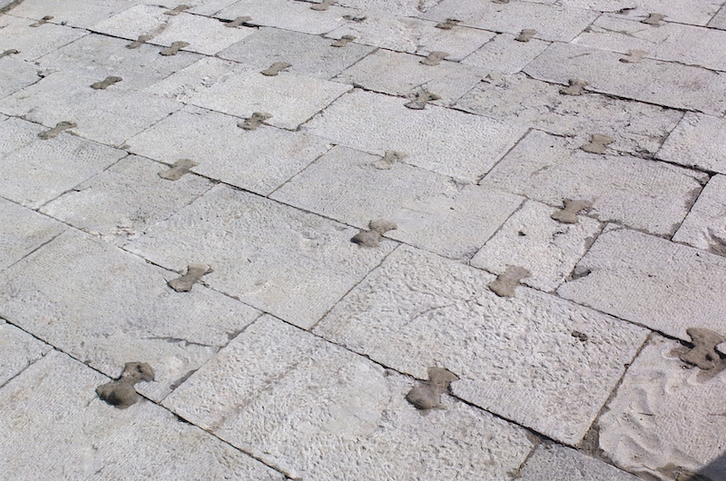 底石又叫过水石,由一块块青石板平铺而成,石板间镶嵌铁锭榫,防止石板错缝移位,石板的缝隙间又填满砂浆,这是为了防止渗水。
